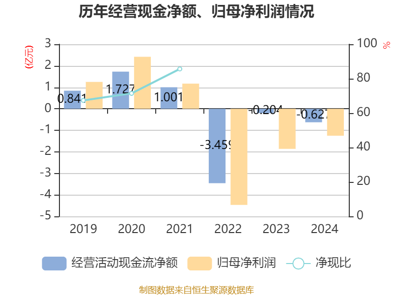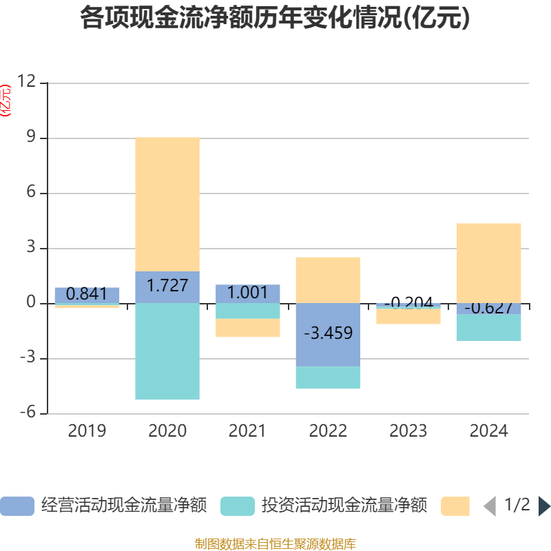截至2024年,公司经营活动现金流净额为-6271.03万元,同比减少4230.87万元;筹资活动现金流净额4.34亿元,同比增加5.16亿元;投资活动现金流净额-1.43亿元,上年同期为-1139.66万元。