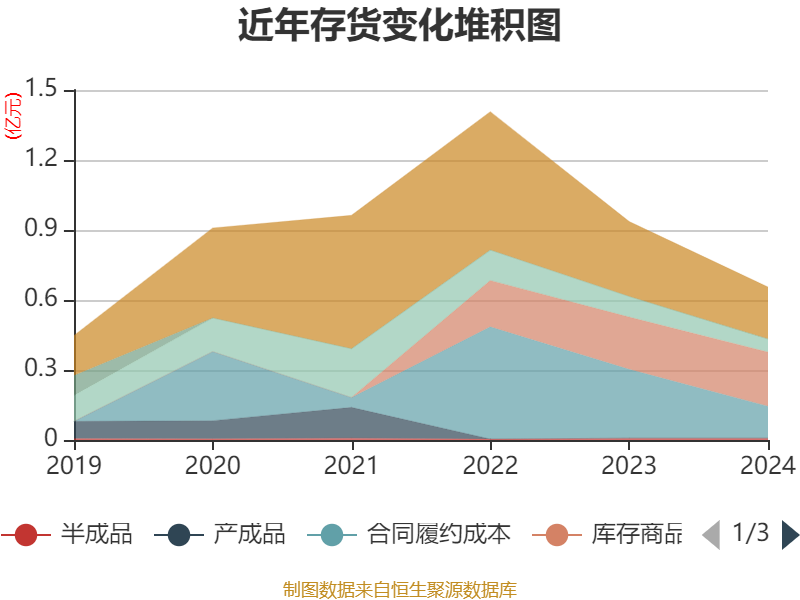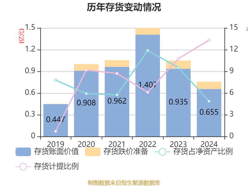 从存货变动来看,截至2024年末,公司存货账面价值为6553.24万元,占净资产的4.85%,较上年末减少2799.39万元。其中,存货跌价准备为1006.32万元,计提比例为13.31%。