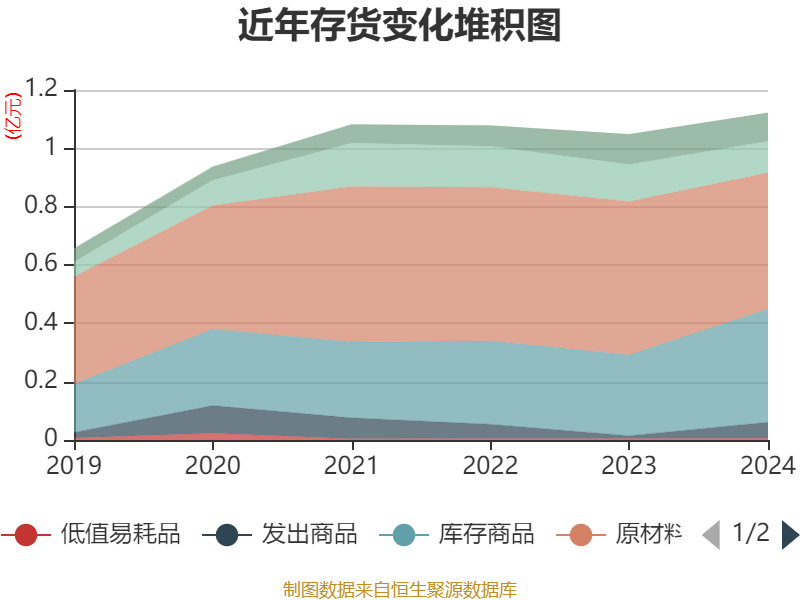 从存货变动来看,截至2024年末,公司存货账面价值为1.12亿元,占净资产的11.85%,较上年末增加750.9万元。其中,存货跌价准备为255.64万元,计提比例为2.23%。
