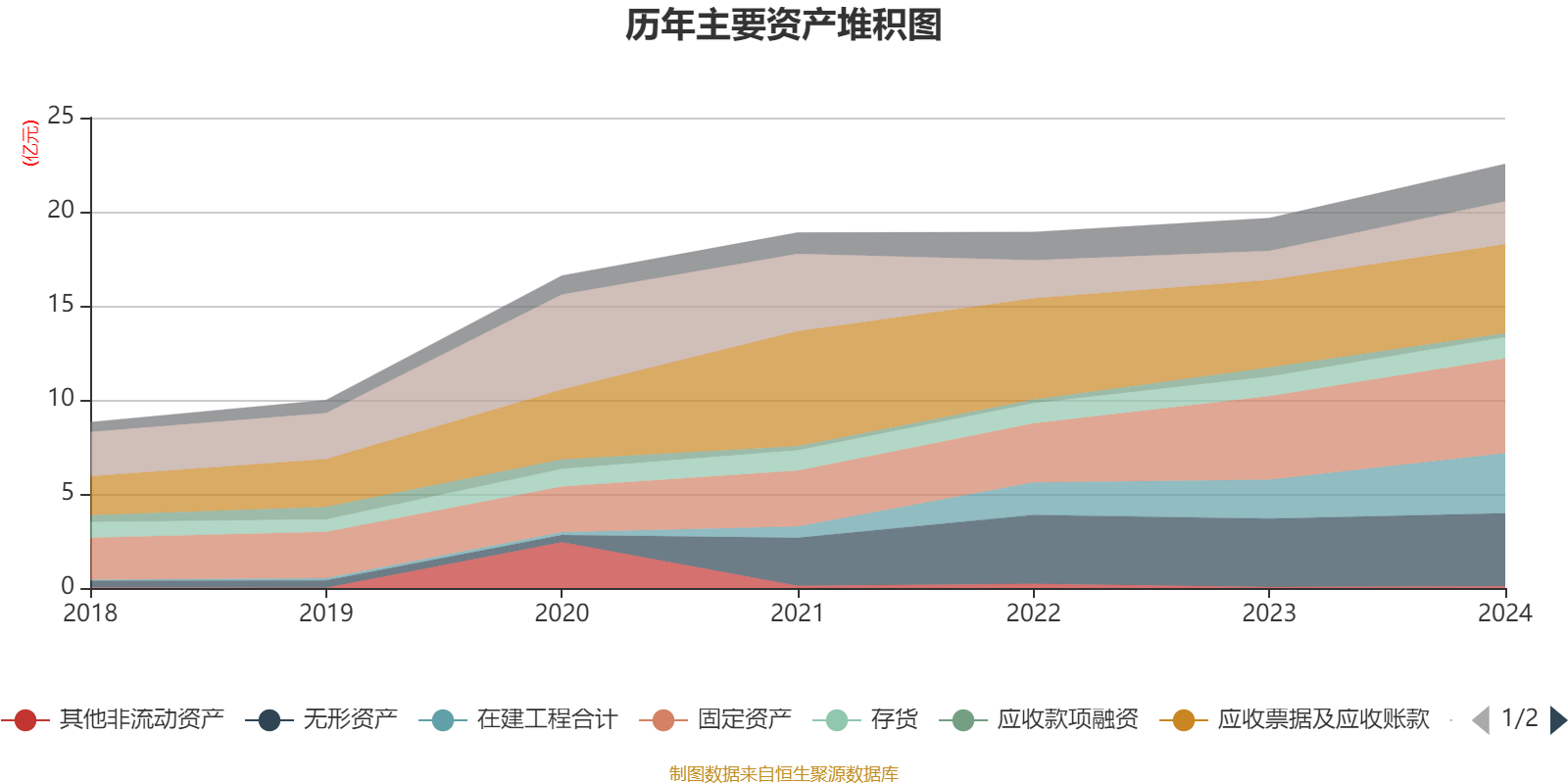 资产重大变化方面,截至2024年末,公司在建工程合计较上年末增加54.47%,占公司总资产比重上升3.66个百分点;应收票据及应收账款较上年末增加1.98%,占公司总资产比重下降2.6个百分点;货币资金较上年末增加45.68%,占公司总资产比重上升2.15个百分点;应收款项融资较上年末减少55.55%,占公司总资产比重下降1.5个百分点。