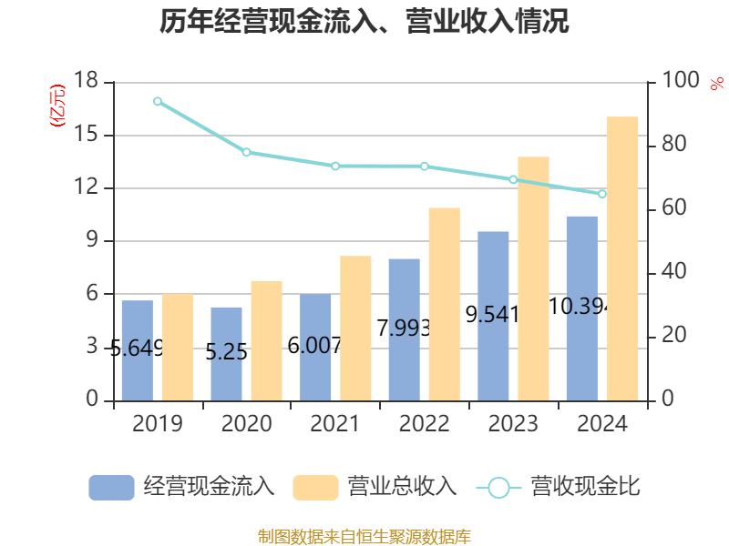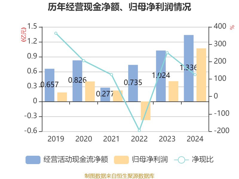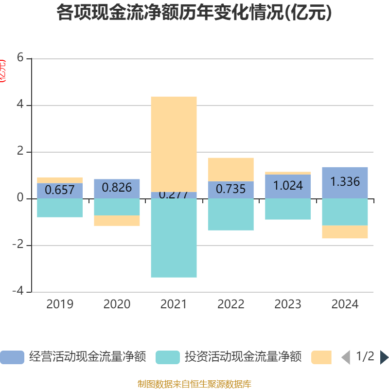 截至2024年,公司经营活动现金流净额为1.34亿元,同比增长30.42%;筹资活动现金流净额-5504.18万元,同比减少6635.35万元;投资活动现金流净额-1.16亿元,上年同期为-9056.56万元。