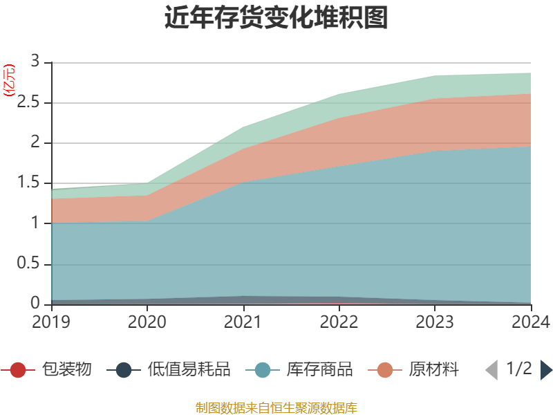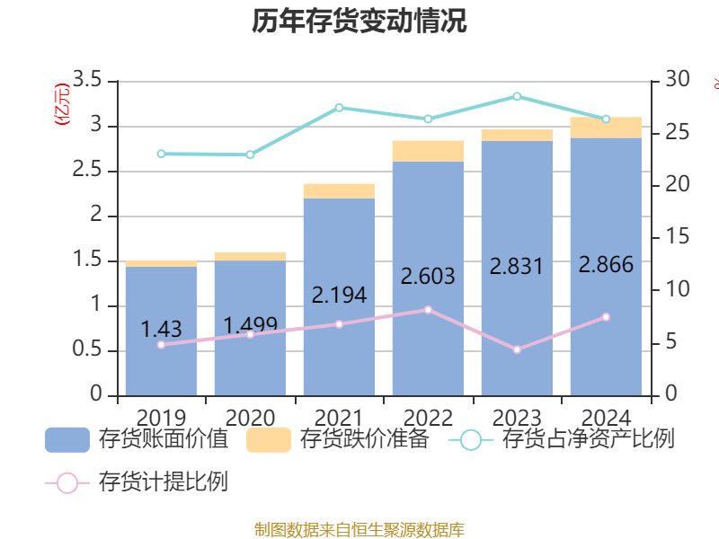 从存货变动来看,截至2024年末,公司存货账面价值为2.87亿元,占净资产的26.35%,较上年末增加346.23万元。其中,存货跌价准备为2313.76万元,计提比例为7.47%。