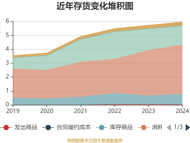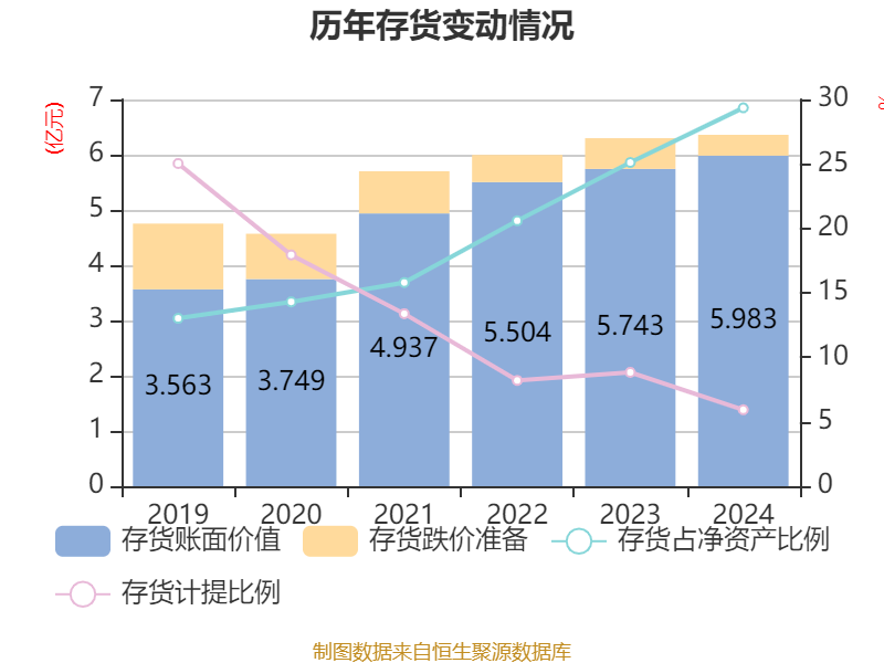 从存货变动来看,截至2024年末,公司存货账面价值为5.98亿元,占净资产的29.35%,较上年末增加2398.42万元。其中,存货跌价准备为3770.05万元,计提比例为5.93%。