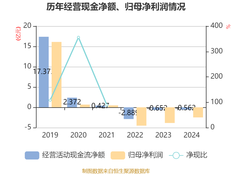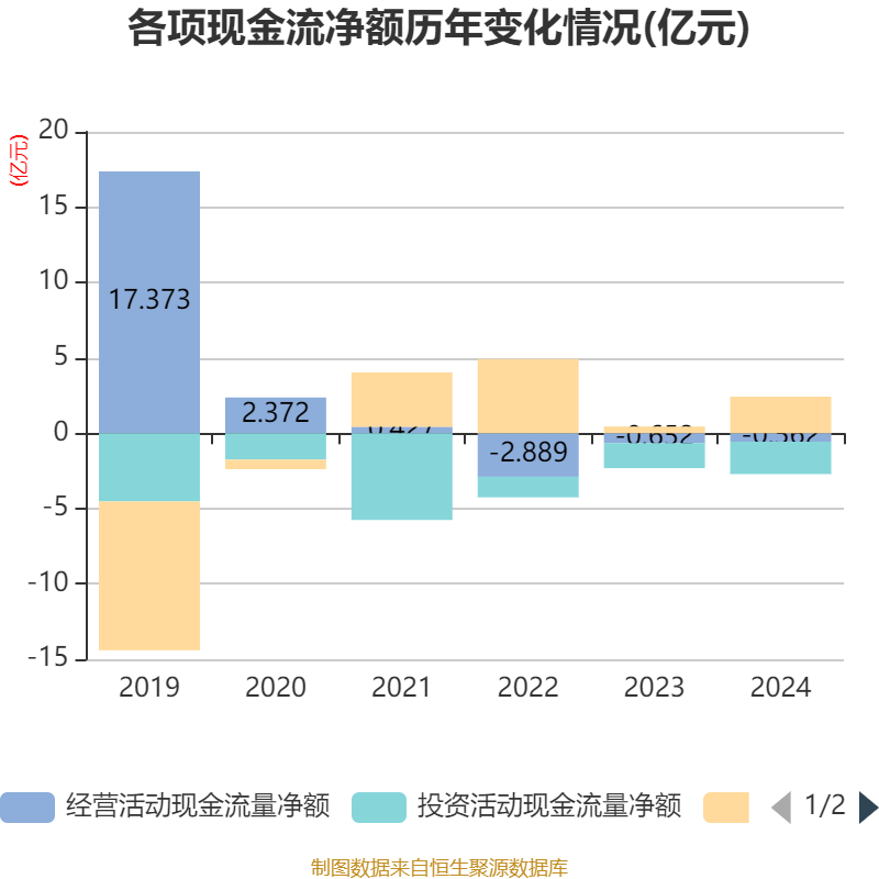 截至2024年,公司经营活动现金流净额为-5618.66万元,同比增加904.32万元;筹资活动现金流净额2.43亿元,同比增加1.98亿元;投资活动现金流净额-2.15亿元,上年同期为-1.66亿元。