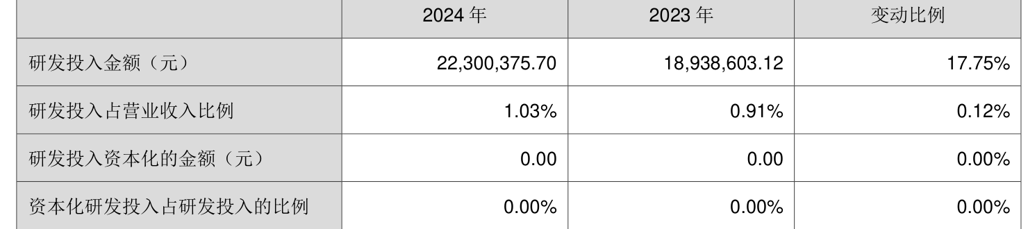 2024年全年,公司研发投入金额为2230.04万元,同比增长17.75%;研发投入占营业收入比例为1.03%,相比上年同期上升0.12个百分点。此外,公司全年研发投入资本化率为0%。