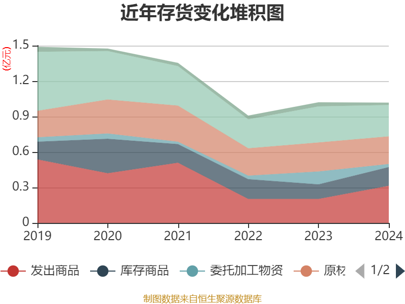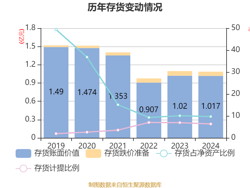 从存货变动来看,截至2024年末,公司存货账面价值为1.02亿元,占净资产的9.73%,较上年末减少24.83万元。其中,存货跌价准备为688.88万元,计提比例为6.34%。