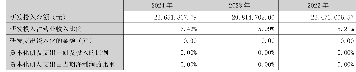 2024年全年,公司研发投入金额为2365.19万元,同比增长13.63%;研发投入占营业收入比例为6.46%,相比上年同期上升0.47个百分点。此外,公司全年研发投入资本化率为0%。