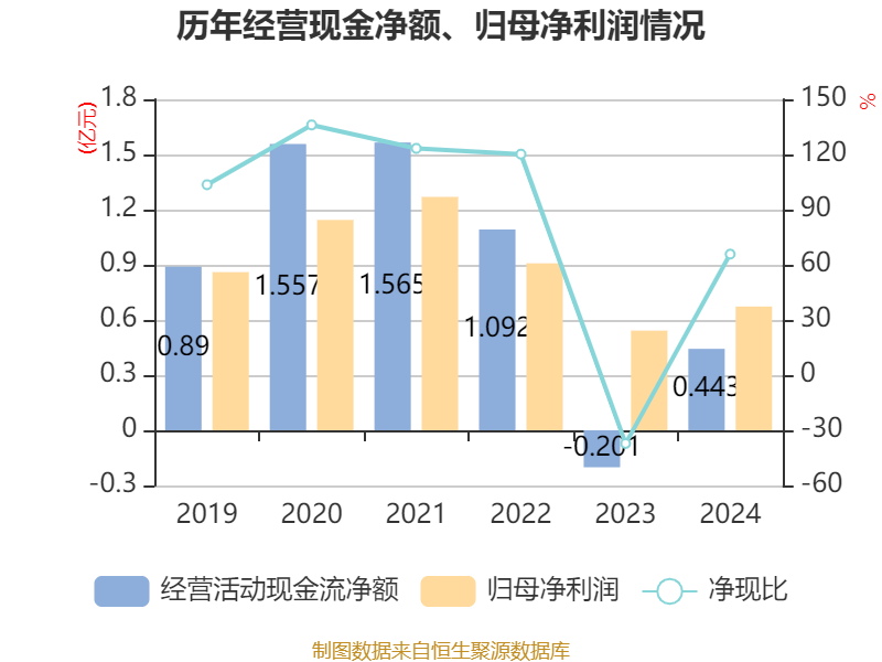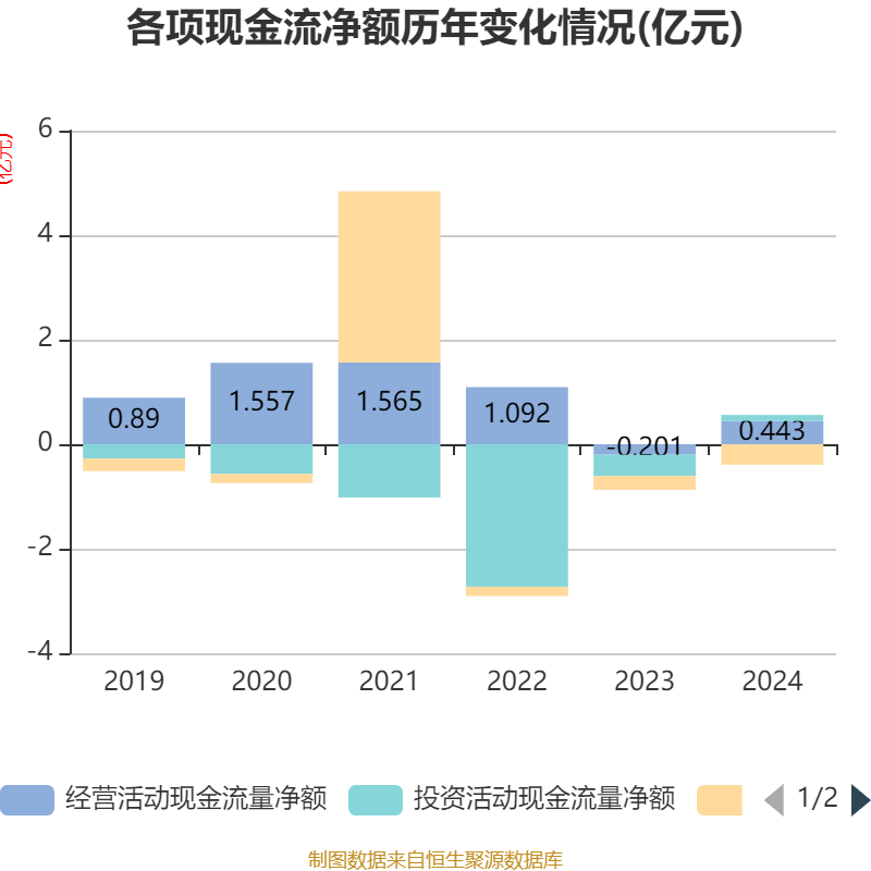 截至2024年,公司经营活动现金流净额为4426.24万元,同比增加6440.76万元;筹资活动现金流净额-3910万元,同比减少1270万元;投资活动现金流净额1168.75万元,上年同期为-4077.19万元。