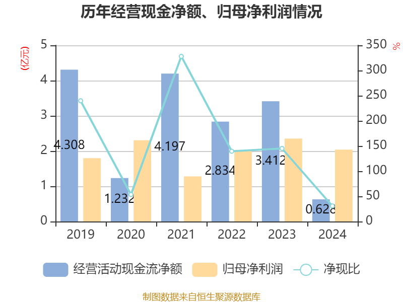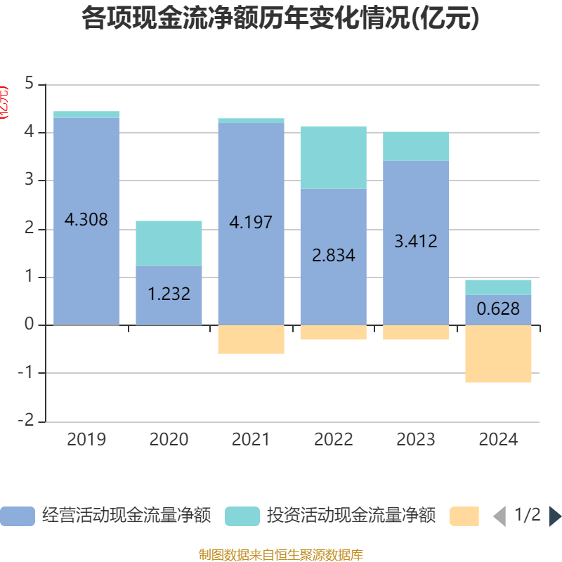 截至2024年,公司经营活动现金流净额为6277.57万元,同比下降81.6%;筹资活动现金流净额-1.19亿元,同比减少8909.08万元;投资活动现金流净额3079.13万元,上年同期为6024.22万元。
