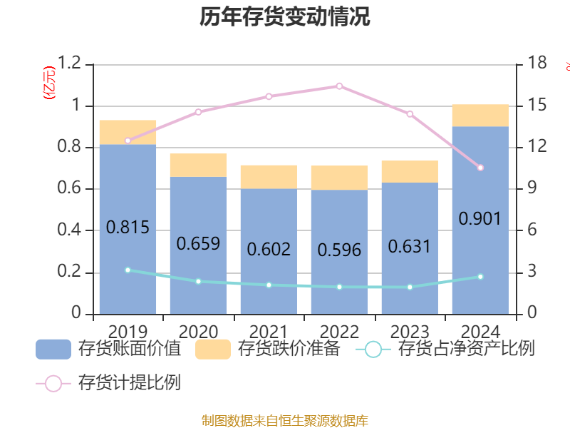 从存货变动来看,截至2024年末,公司存货账面价值为9011.71万元,占净资产的2.68%,较上年末增加2705.89万元。其中,存货跌价准备为1061.23万元,计提比例为10.54%。