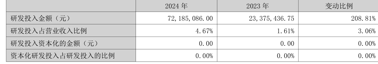 2024年全年,公司研发投入金额为7218.51万元,同比增长208.81%;研发投入占营业收入比例为4.67%,相比上年同期上升3.06个百分点。此外,公司全年研发投入资本化率为0%。