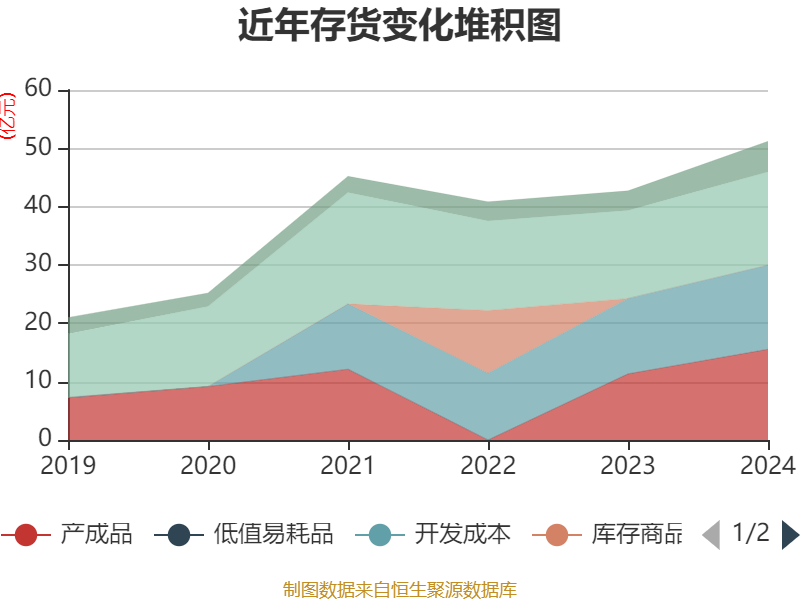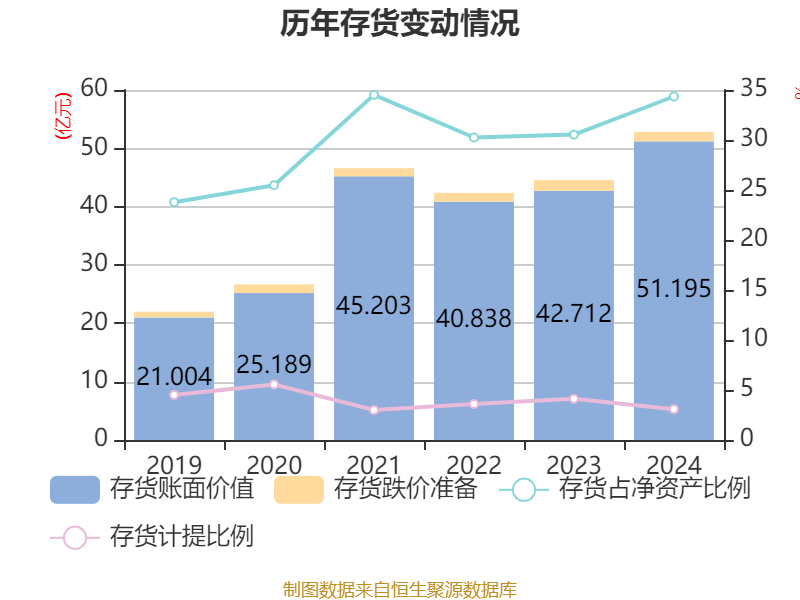 从存货变动来看,截至2024年末,公司存货账面价值为51.19亿元,占净资产的34.35%,较上年末增加8.48亿元。其中,存货跌价准备为1.63亿元,计提比例为3.08%。
