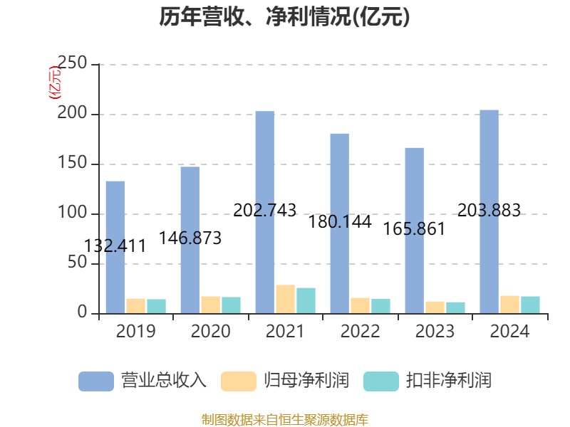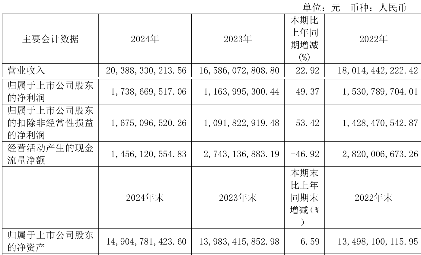 中证智能财讯生益科技(600183)3月29日披露2024年年度报告。2024年,公司实现营业总收入203.88亿元,同比增长22.92%;归母净利润17.39亿元,同比增长49.37%;扣非净利润16.75亿元,同比增长53.42%;经营活动产生的现金流量净额为14.56亿元,同比下降46.92%;报告期内,生益科技基本每股收益为0.74元,加权平均净资产收益率为12.17%。公司2024年度分配预案为:拟向全体股东每10股派现6元(含税)。