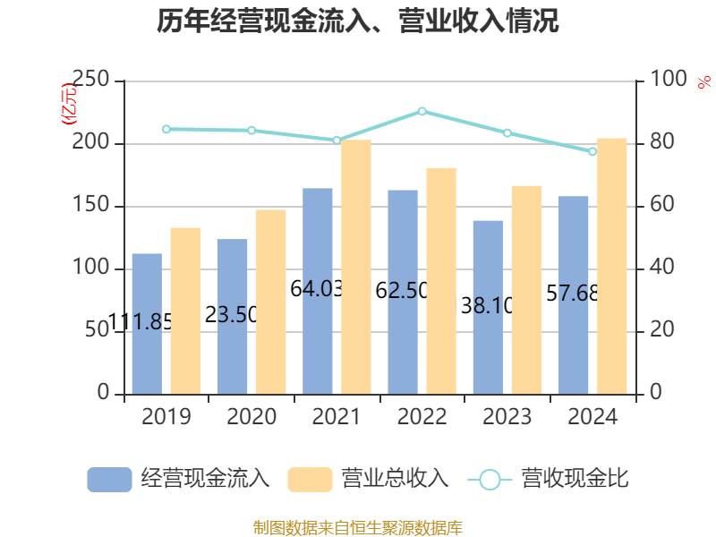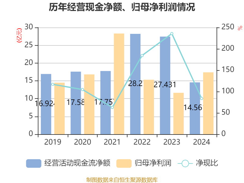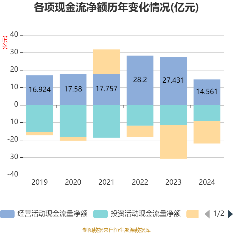 截至2024年,公司经营活动现金流净额为14.56亿元,同比下降46.92%;筹资活动现金流净额-12.76亿元,同比增加6.43亿元;投资活动现金流净额-9.34亿元,上年同期为-11.62亿元。