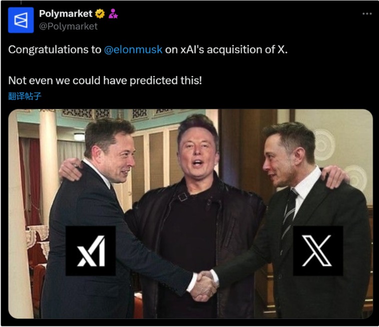 去中心化预测平台Polymarket发了一张梗图:马斯克双手搭在两个代表“xAI”和“X”的马斯克的肩上,并配文称“xAI收购X,恭喜马斯克。我们甚至没预测到这一点。”