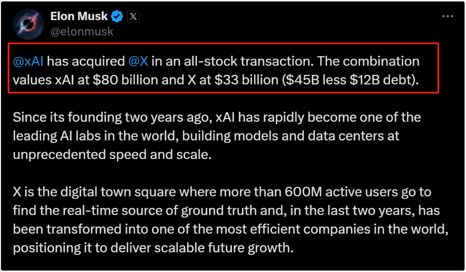 马斯克发文称:“xAI和X的未来息息相关。今天,我们正式迈出整合数据、模型、算力、分发渠道和人才的关键一步。此次合并将释放巨大潜力,把xAI的先进人工智能能力与X的广泛影响力相结合。”