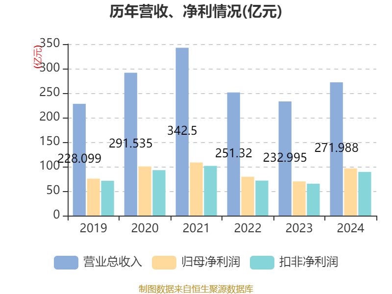 中证智能财讯广发证券(000776)3月29日披露2024年年度报告。2024年,公司实现营业总收入271.99亿元,同比增长16.74%;归母净利润96.37亿元,同比增长38.11%;扣非净利润89.15亿元,同比增长36.99%;经营活动产生的现金流量净额为99.71亿元,上年同期为-89.19亿元;报告期内,广发证券基本每股收益为1.15元,加权平均净资产收益率为7.44%。公司2024年度分配预案为:拟向全体股东每10股派现4元(含税)。