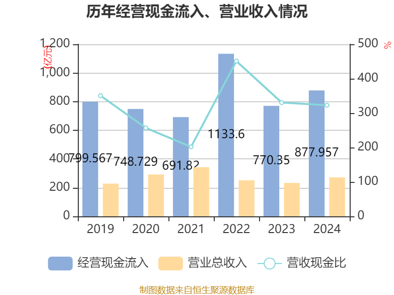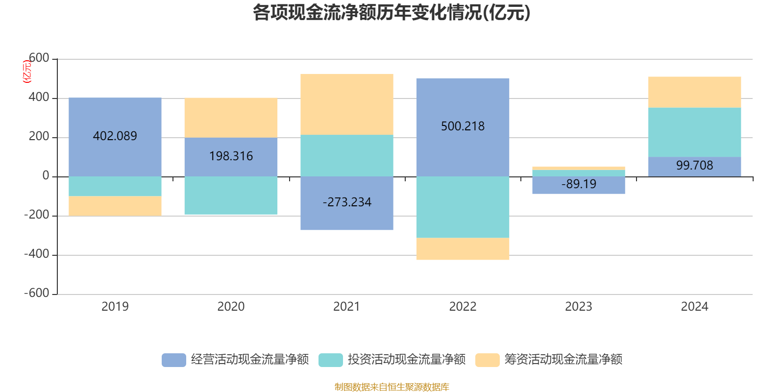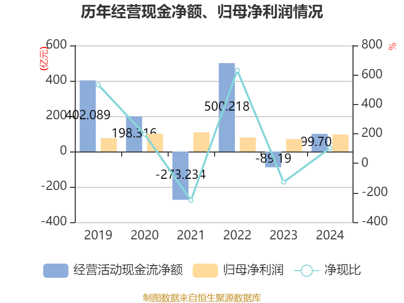 截至2024年,公司经营活动现金流净额为99.71亿元,同比增加188.9亿元;筹资活动现金流净额157.17亿元,同比增加140.81亿元;投资活动现金流净额251.79亿元,上年同期为33.43亿元。