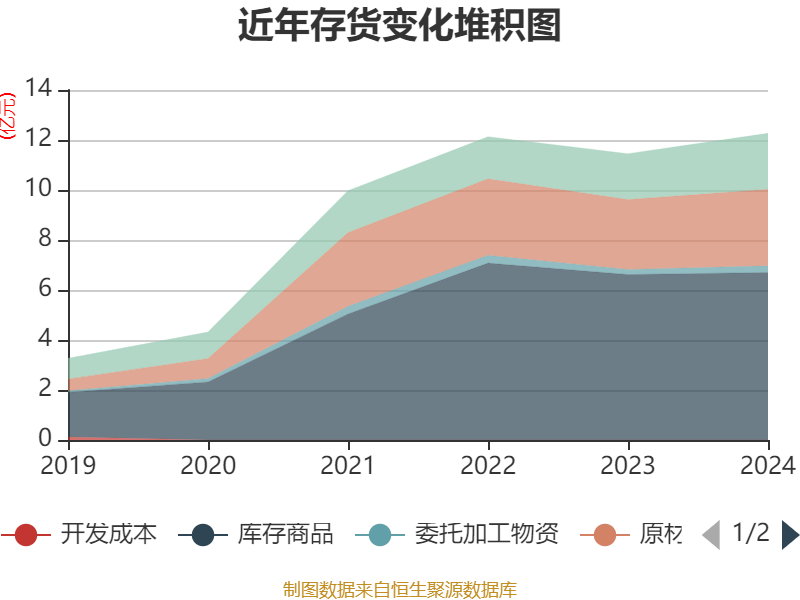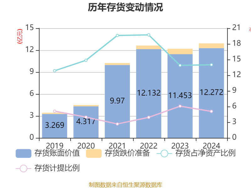 从存货变动来看,截至2024年末,公司存货账面价值为12.27亿元,占净资产的14%,较上年末增加8185.75万元。其中,存货跌价准备为6560.44万元,计提比例为5.07%。
