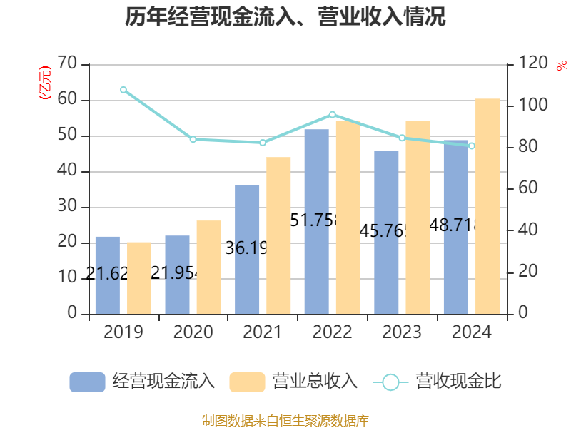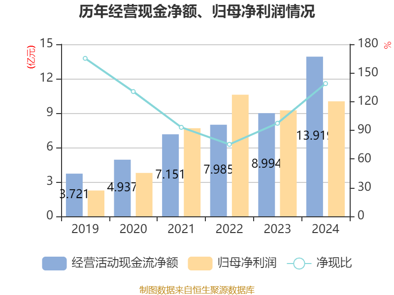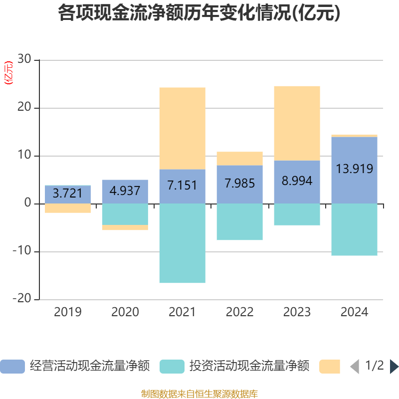 截至2024年,公司经营活动现金流净额为13.92亿元,同比增长54.76%;筹资活动现金流净额4575.72万元,同比减少15.05亿元;投资活动现金流净额-10.88亿元,上年同期为-4.56亿元。