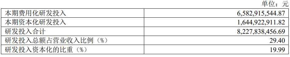 2024年全年,公司研发投入金额为82.28亿元,同比增长33.79%;研发投入占营业收入比例为29.4%,相比上年同期上升2.45个百分点。此外,公司全年研发投入资本化率为19.99%。