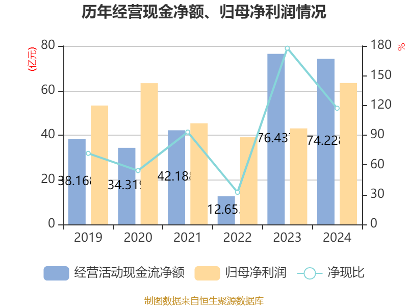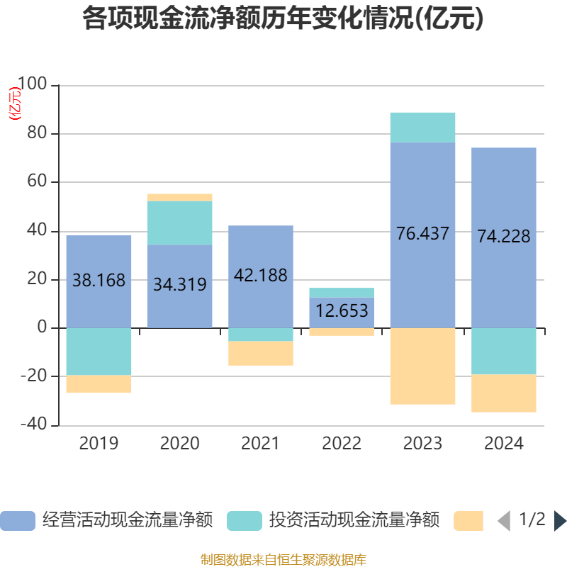 截至2024年,公司经营活动现金流净额为74.23亿元,同比下降2.89%;筹资活动现金流净额-15.51亿元,同比增加15.94亿元;投资活动现金流净额-19.12亿元,上年同期为12.22亿元。