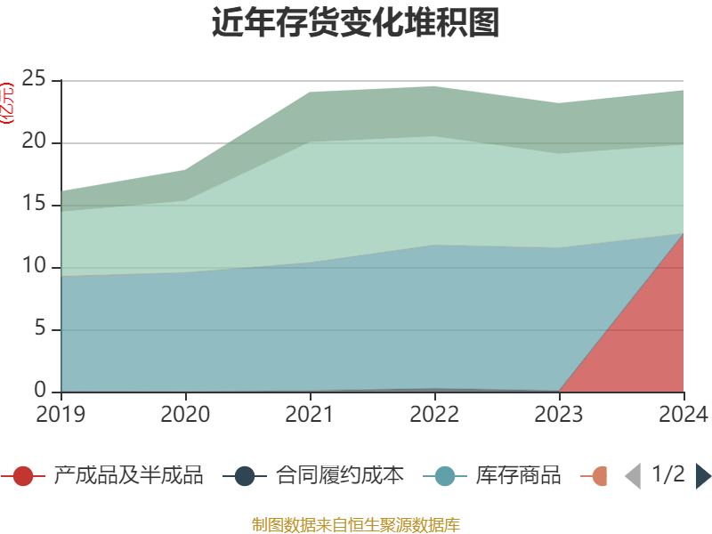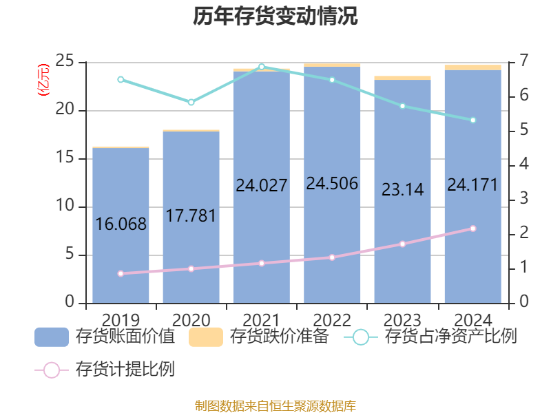 从存货变动来看,截至2024年末,公司存货账面价值为24.17亿元,占净资产的5.31%,较上年末增加1.03亿元。其中,存货跌价准备为5327.46万元,计提比例为2.16%。