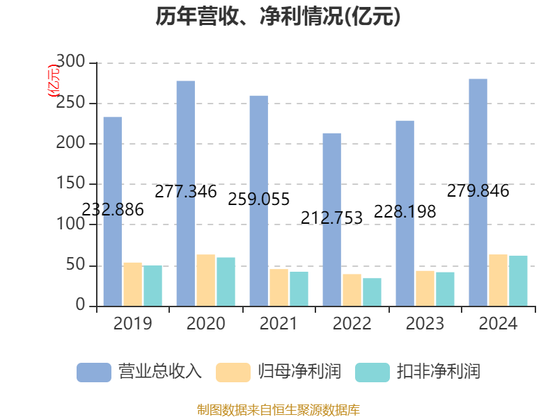 中证智能财讯恒瑞医药(600276)3月31日披露2024年年度报告。2024年,公司实现营业总收入279.85亿元,同比增长22.63%;归母净利润63.37亿元,同比增长47.28%;扣非净利润61.78亿元,同比增长49.18%;经营活动产生的现金流量净额为74.23亿元,同比下降2.89%;报告期内,恒瑞医药基本每股收益为1.00元,加权平均净资产收益率为14.73%。公司2024年度分配预案为:拟向全体股东每10股派现2元(含税)。
