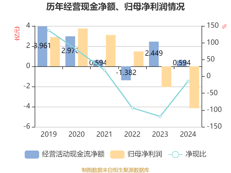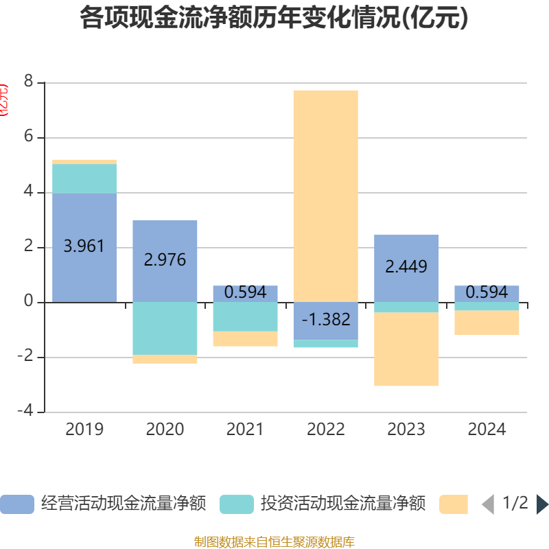 截至2024年,公司经营活动现金流净额为5936.25万元,同比下降75.76%;筹资活动现金流净额-8848.81万元,同比增加1.78亿元;投资活动现金流净额-3152.9万元,上年同期为-3880.29万元。