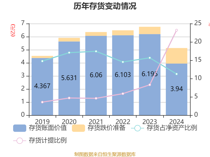 从存货变动来看,截至2024年末,公司存货账面价值为3.94亿元,占净资产的11.23%,较上年末减少2.25亿元。其中,存货跌价准备为1.19亿元,计提比例为23.18%。