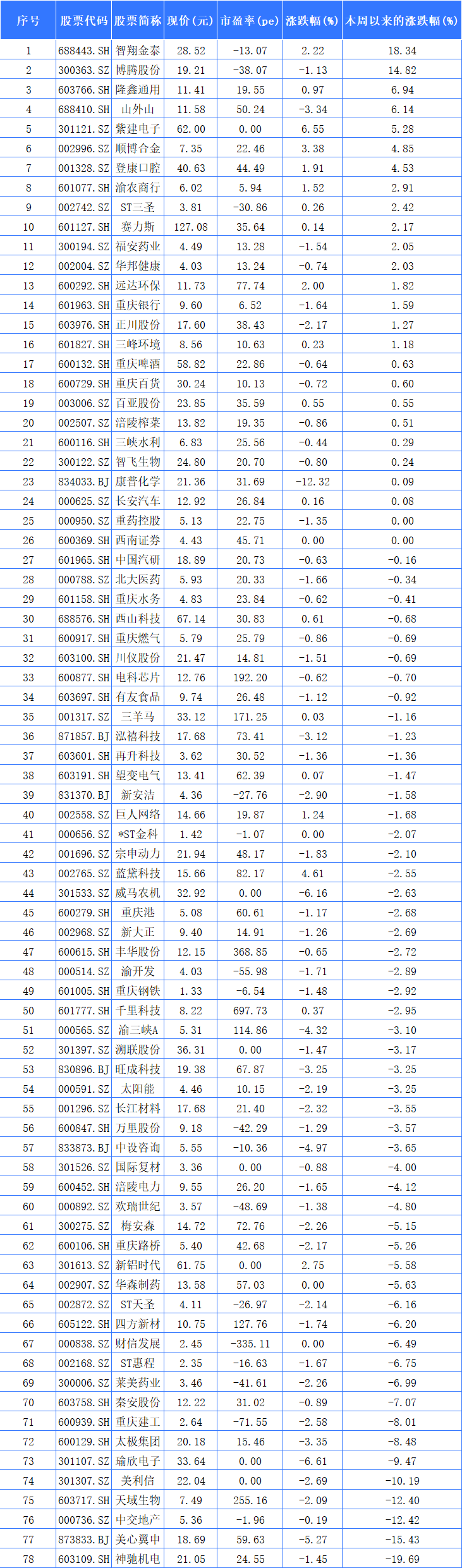 3月28日,本周交易日结束,78家重庆A股,其中收涨24家,收跌52家。