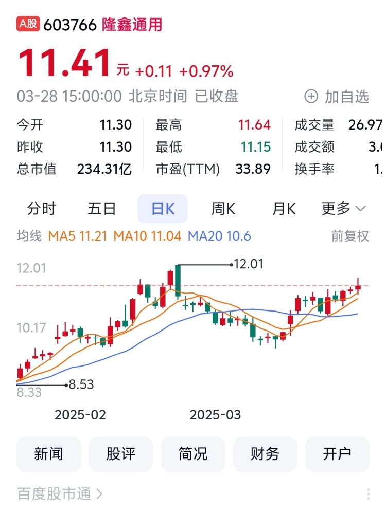 隆鑫通用3月28日报收11.41元,日涨幅0.97%,换手率1.31%,本周涨幅达6.94%,列本周渝股涨幅第三。