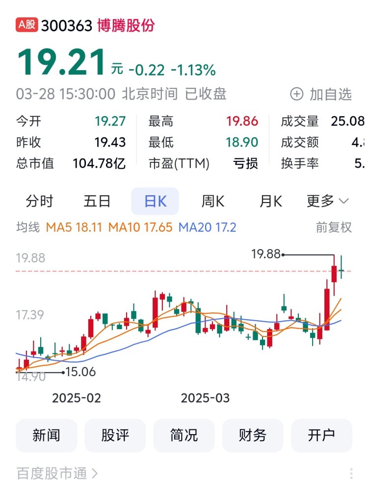 博腾股份3月28日报收19.21元,日跌幅1.13%,换手率5.01%,本周涨幅达14.82%,列本周渝股涨幅第二。