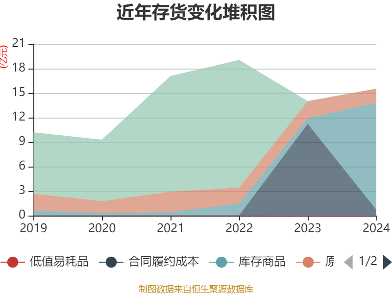 从存货变动来看,截至2024年末,公司存货账面价值为15.52亿元,占净资产的36.78%,较上年末增加1.53亿元。其中,存货跌价准备为5206.03万元,计提比例为3.25%。
