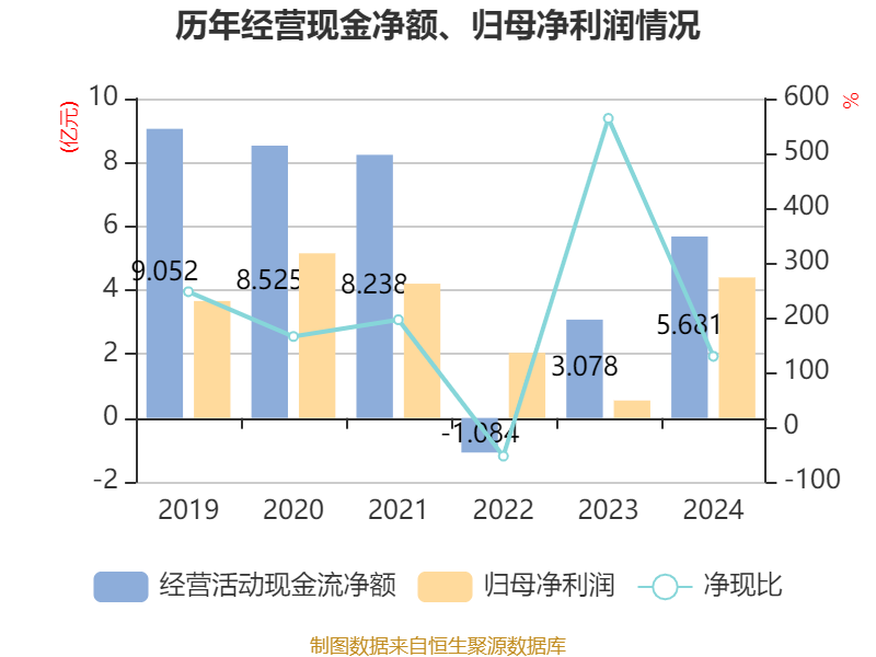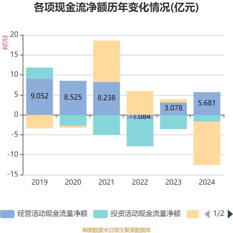 截至2024年,公司经营活动现金流净额为5.68亿元,同比增长84.59%;筹资活动现金流净额-10.91亿元,同比减少11.72亿元;投资活动现金流净额-1.66亿元,上年同期为-3.59亿元。
