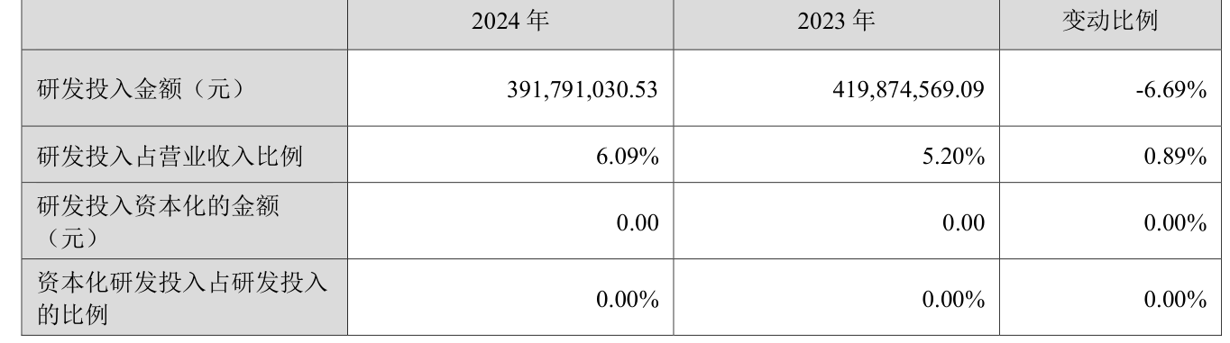 2024年全年,公司研发投入金额为3.92亿元,同比下降6.69%;研发投入占营业收入比例为6.09%,相比上年同期上升0.89个百分点。此外,公司全年研发投入资本化率为0%。