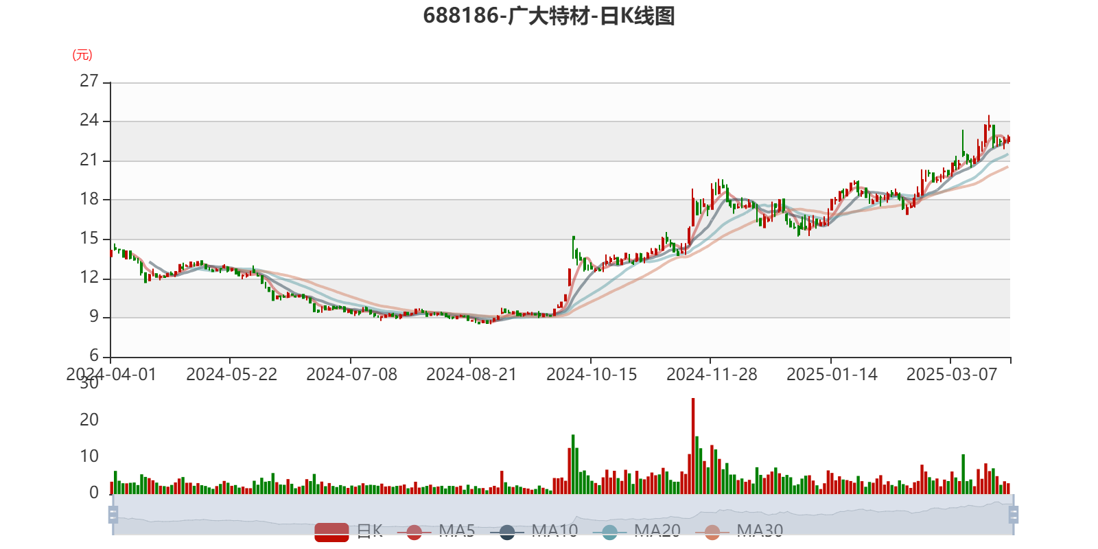 中证智能财讯广大特材(688186)3月30日晚间披露业绩预告,预计2025年一季度实现营业收入11.2亿元,同比增长25.56%;归母净利润7500万元,同比增长1504.79%;扣非净利润预计7200万元,同比增长2172.15%。以最新收盘价计算,市净率(LF)约1.45倍,市销率(TTM)约4.36倍。
