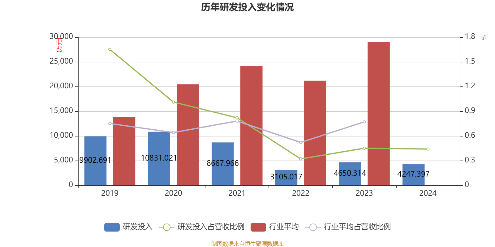 2024年全年,公司研发投入金额为4247.4万元,同比下降8.66%;研发投入占营业收入比例为0.44%,相比上年同期下降0.01个百分点。此外,公司全年研发投入资本化率为0%。
