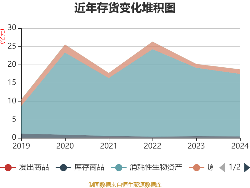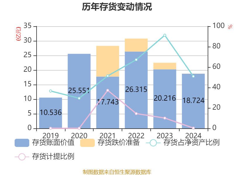 从存货变动来看,截至2024年末,公司存货账面价值为18.72亿元,占净资产的50.95%,较上年末减少1.49亿元。其中,存货跌价准备为511.54万元,计提比例为0.27%。