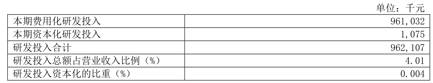 2024年全年,公司研发投入金额为9.62亿元,同比增长1.9%;研发投入占营业收入比例为4.01%,相比上年同期下降0.22个百分点。此外,公司全年研发投入资本化率为0%。