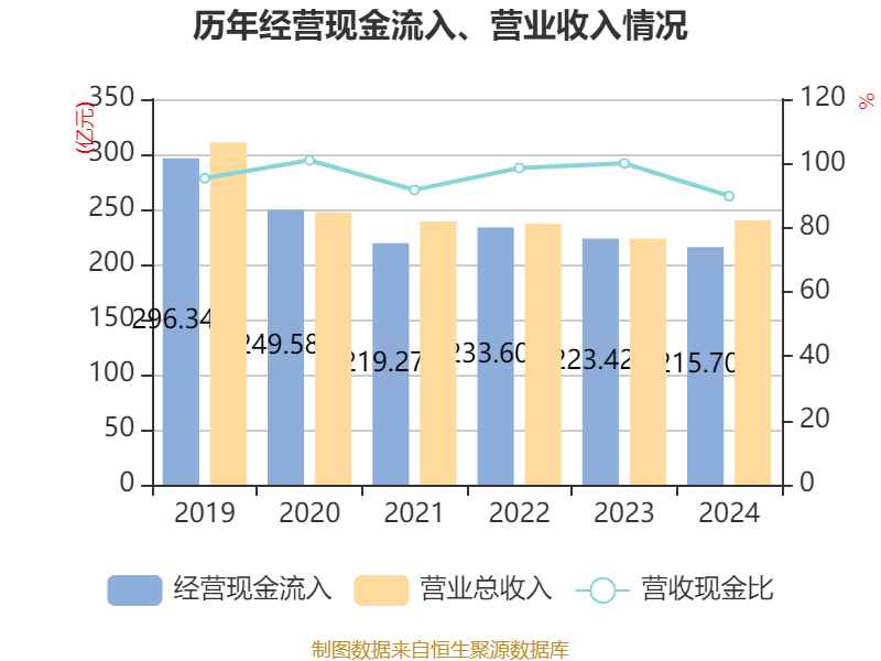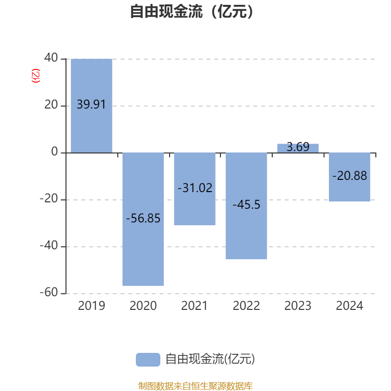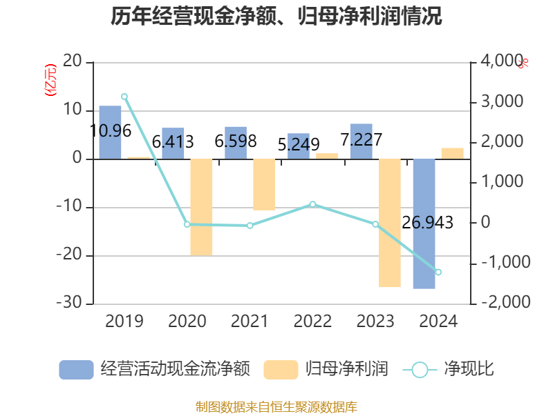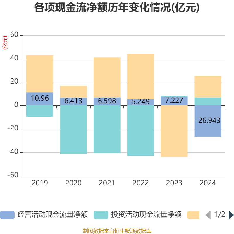 截至2024年,公司经营活动现金流净额为-26.94亿元,同比减少34.17亿元;筹资活动现金流净额18.36亿元,同比增加62.48亿元;投资活动现金流净额6.62亿元,上年同期为9459.7万元。