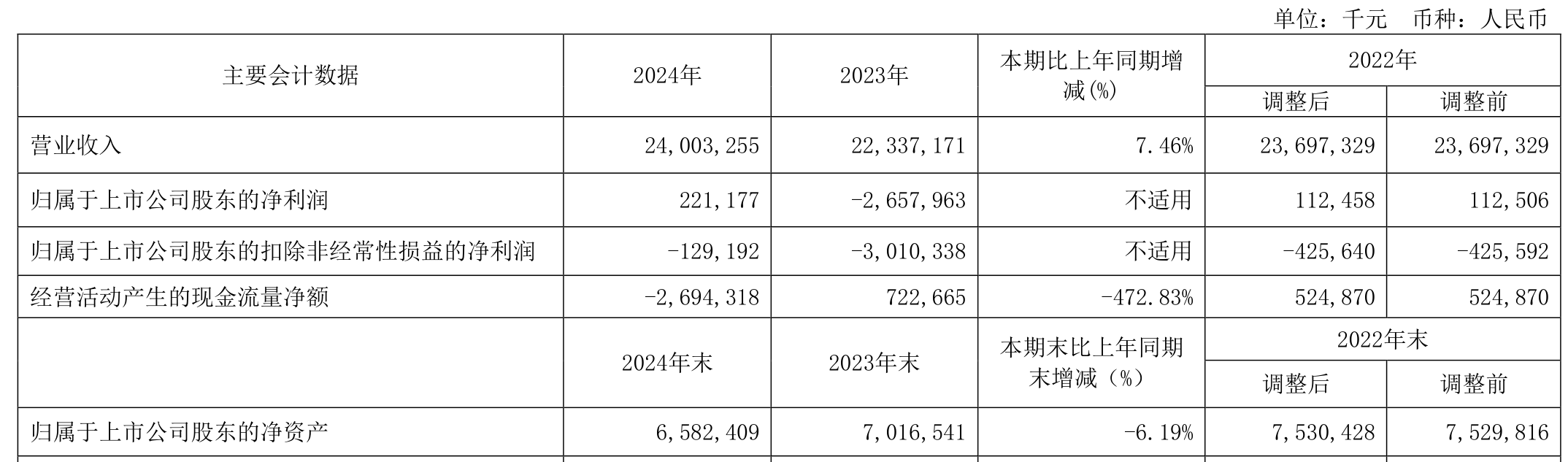 中证智能财讯中铝国际(601068)3月29日披露2024年年度报告。2024年,公司实现营业总收入240.03亿元,同比增长7.46%;归母净利润2.21亿元,同比扭亏;扣非净利润亏损1.29亿元,上年同期亏损30.1亿元;经营活动产生的现金流量净额为-26.94亿元,上年同期为7.23亿元;报告期内,中铝国际基本每股收益为0.019元,加权平均净资产收益率为2.46%。