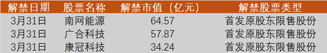 Wind数据显示,本周A股市场将有25只股票面临解禁,合计解禁数量为20.22亿股,按最新收盘价计算,合计解禁市值为207.84亿元,较本周解禁市值环比减少55.34%。从解禁股情况来看,本周解禁市值排名前3的是南网能源、广合科技、康冠科技,解禁市值分别为64.57亿元、57.87亿元、34.24亿元,解禁日期均为3月31日,同时都是首发原股东限售股份。