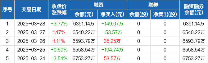 融资方面,当日融资买入375.51万元,融资偿还524.59万元,融资净偿还149.07万元。融券方面,融券卖出0股,融券偿还0股,融券余量0股,融券余额0元。融资融券余额合计6391.14万元。