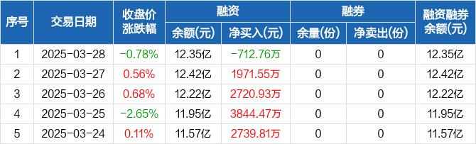融资方面,当日融资买入2.08亿元,融资偿还2.15亿元,融资净偿还712.76万元。融券方面,融券卖出0份,融券偿还0份,融券余量0份,融券余额0元。融资融券余额合计12.35亿元。