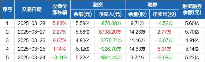 融资方面,当日融资买入2.71亿元,融资偿还2.79亿元,融资净偿还870.08万元。融券方面,融券卖出4500股,融券偿还4.97万股,融券余量9.71万股,融券余额143.9万元。融资融券余额合计5.6亿元。