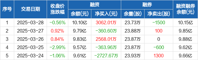 融资方面,当日融资买入5776.95万元,融资偿还2714.93万元,融资净买入3062.01万元。融券方面,融券卖出400股,融券偿还1900股,融券余量23.73万股,融券余额545.08万元。融资融券余额合计10.15亿元。