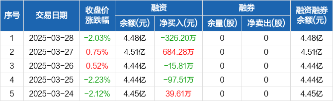 融资方面,当日融资买入1137.18万元,融资偿还1463.38万元,融资净偿还326.2万元。融券方面,融券卖出0股,融券偿还0股,融券余量0股,融券余额0元。融资融券余额合计4.48亿元。