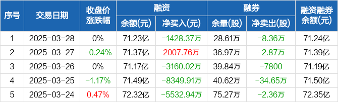 融资方面,当日融资买入2.06亿元,融资偿还2.2亿元,融资净偿还1428.37万元。融券方面,融券卖出1.99万股,融券偿还10.35万股,融券余量28.61万股,融券余额120.45万元。融资融券余额合计71.24亿元。