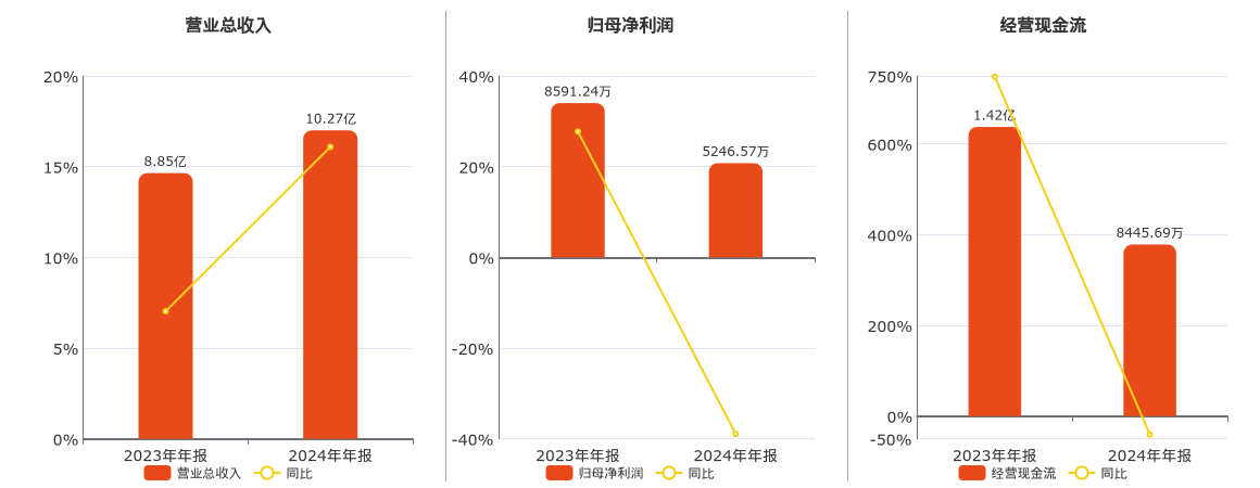 公司营业总收入为10.27亿元。归母净利润为5246.57万元,较去年同报告期归母净利润减少3344.67万元,同比较去年同期下降38.93%。经营活动现金净流入为8445.69万元,较去年同报告期经营活动现金净流入减少5786.34万元,同比较去年同期下降40.66%。